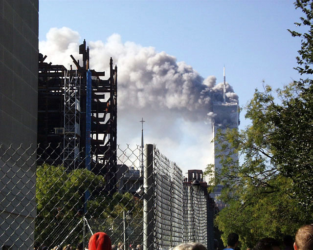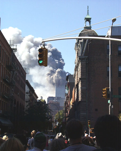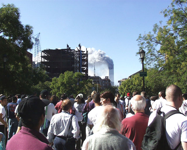 The people around me in the park were aware that planes had crashed into the buildings, but there was still a question as to the full extent of the attacks. For quite some time, there was concern that more hijacked planes were on their way. There was also concern among us—fueled by radio reports and the observation that the southern tower collapsed without another plane impact—that there were bombs on the ground. Whatever the case, we figured that we were in a relatively safe location because the buildings near us were short and unimportant. I tried calling home a couple of times but couldn’t get a signal. I eventually put the phone away, deciding that any cellular bandwidth available was best allocated to someone else. There was little in the way of news to be had, and all we could do at this point was to look south at the one remaining tower belching thick, black smoke. People were saying that there were workers jumping from the tower, but I didn’t see anyone leap. If you looked straight into the massive hole in the front of the building, it seemed as if a bunch of white confetti was flying everywhere. It wasn’t just falling down, it was blowing in all directions. It might have just been office paper reflecting the sun. Around 10:30 am, I was staring right at the gaping hole in the northern tower when it went down. At the time, I could have sworn I saw a red flash—maybe just of flames being forced out of the hole as the floors collapsed—right as the building fell. I also thought that the top came down at an angle (i.e, it didn’t just fall straight down), but I saw neither of those things on television replays later in the day. There was a pop and a muffled rumble, but I don’t recall anything particularly loud or any shaking of the ground associated with the collapse.